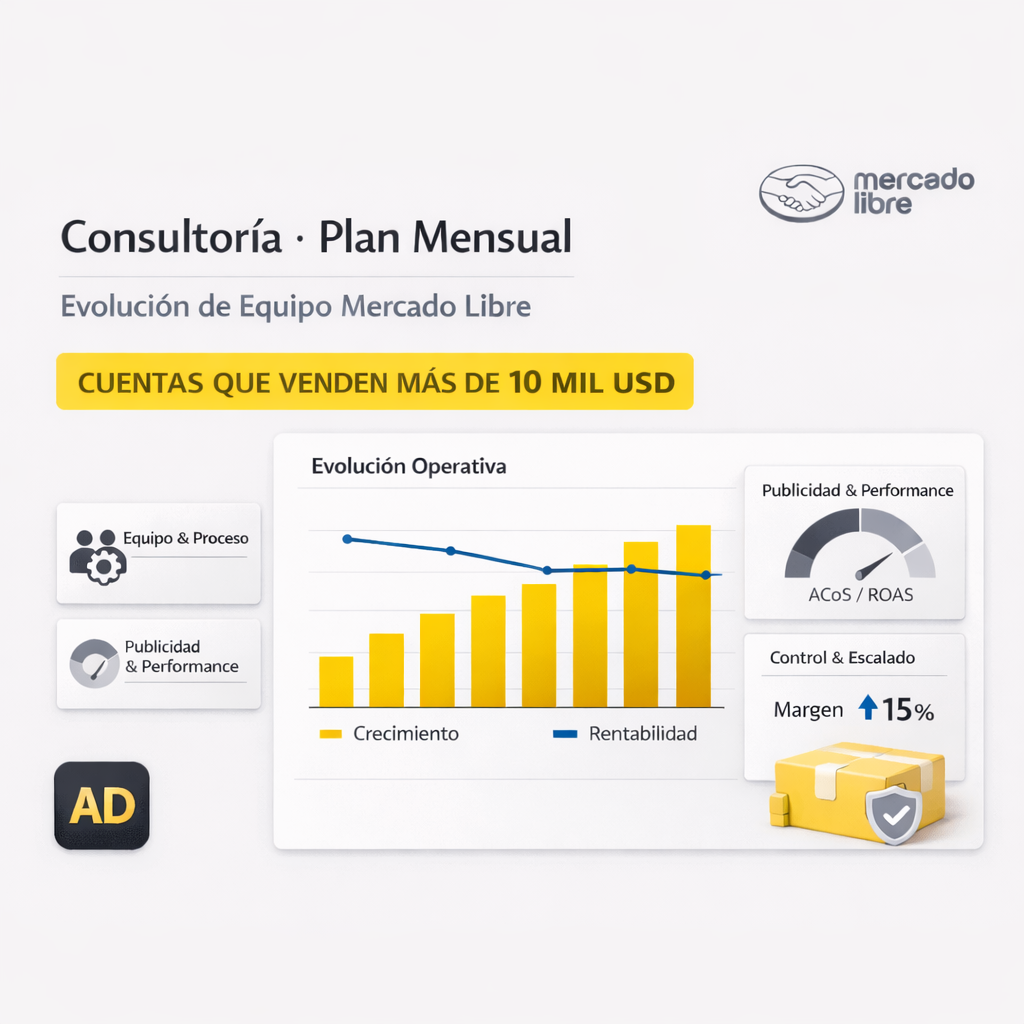 - Capacitación en uso de herramientas, buenas prácticas de Mercado Libre y métricas básicas (ventas, ACOS, ROAS, reputación).